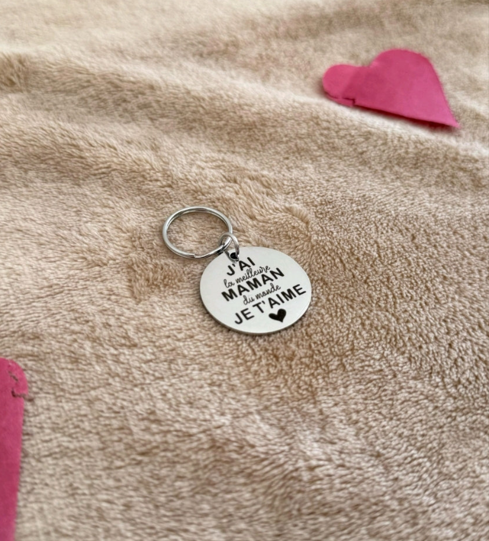 Exprimez votre amour avec le Porte-clé Rond dédié à votre maman. Ce porte-clé, personnalisé avec un joli texte gravé, est un cadeau intemporel qui accompagne votre maman chaque jour. Grâce à sa gravure délicate, le texte reste intact, symbolisant un message d’amour durable. Parfait pour un petit clin d'œil affectueux à offrir pour toutes les occasions.