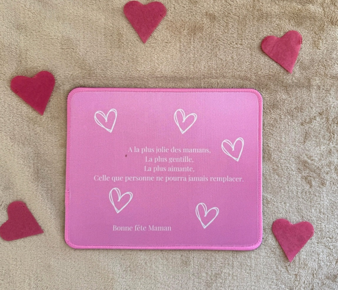 Modèle Rose avec Texte et Cœurs : Ce tapis de souris au design doux et féminin, orné de jolis cœurs et de mots pleins de tendresse, apportera une touche chaleureuse et affectueuse à l’espace de travail de votre maman. Un petit geste plein d’amour qu’elle pourra apprécier chaque jour.